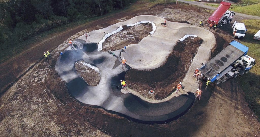 Conception réalisation d’une pumptrack dans la vallée verte Le village d’Habère-Poche dans le 74 a fait appel à nous pour dessiner et réaliser sa pumptrack en enrobé.